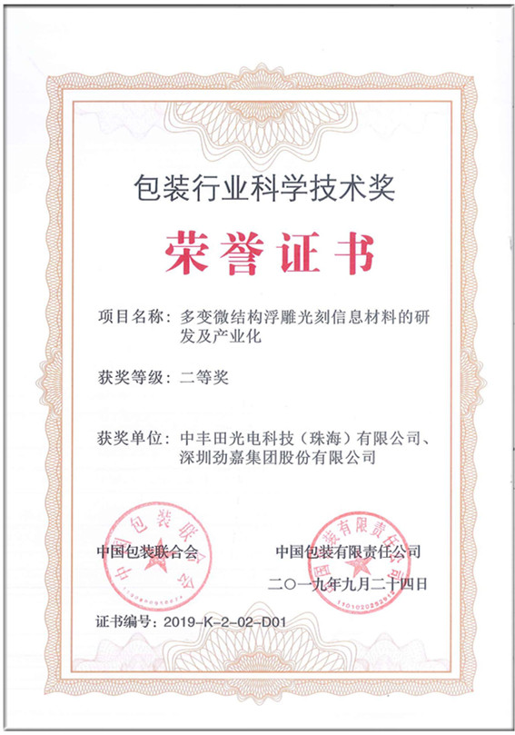 光学材料研究所目前设立创意设计、光刻制版、工艺研发和化工实验中心四个版块。先后研发推出水晶浮雕、多通道3D动态、真彩色图像、激光隐藏防伪和多变微结构等新光刻技术,同时研发出新型无溶剂复合、UV转铝复制、冷烫后印刷等新工艺新材料。其中多变微结构浮雕光刻技术的研发荣获“2019年中国包装行业包装科学技术进步二等奖”